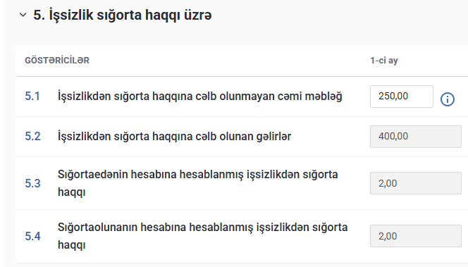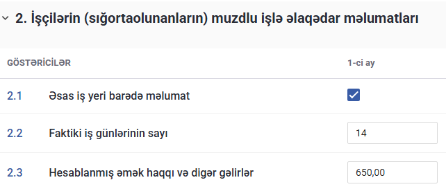 İlk olaraq, vahid bəyannamənin 1 saylı əlavəsində işçinin ümumi gəliri 650 manat (400 manat əmək haqqı + 250 manat müavinət) kimi qeyd edilir. Eyni zamanda, işçi 5 iş günü işləmədiyinə görə işlədiyi günlərin sayı 14 iş günü (19 – 5) kimi göstərilir.