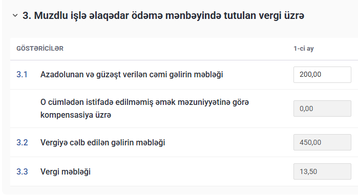 Beləliklə, vahid bəyannamənin “Əsas hissə” → “Hissə 3” bölməsində (güzəştlər və azadolmalar üzrə) məlumatlar sistemləşdirilmiş şəkildə əks olunur:
