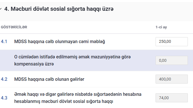 Əmək qabiliyyətinin itirilməsinə görə müavinət məbləği, eyni zamanda 4 saylı “İşçilərin muzdlu işə cəlb olunmayan gəlirləri barədə məlumat” əlavəsində də qeyd edilməlidir. Burada “MDSS”, “İşsizlikdən sığorta” və “İcbari tibbi sığorta” bölmələri üzrə