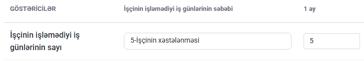 İşçinin işləmədiyi günlər barədə məlumatlar 1 saylı əlavənin 3-cü altbölməsində qeyd edilməlidir. Misalımıza əsasən, işçi 5 iş günü əmək qabiliyyətini müvəqqəti itirdiyi üçün bu məlumat müvafiq qaydada daxil edilir.