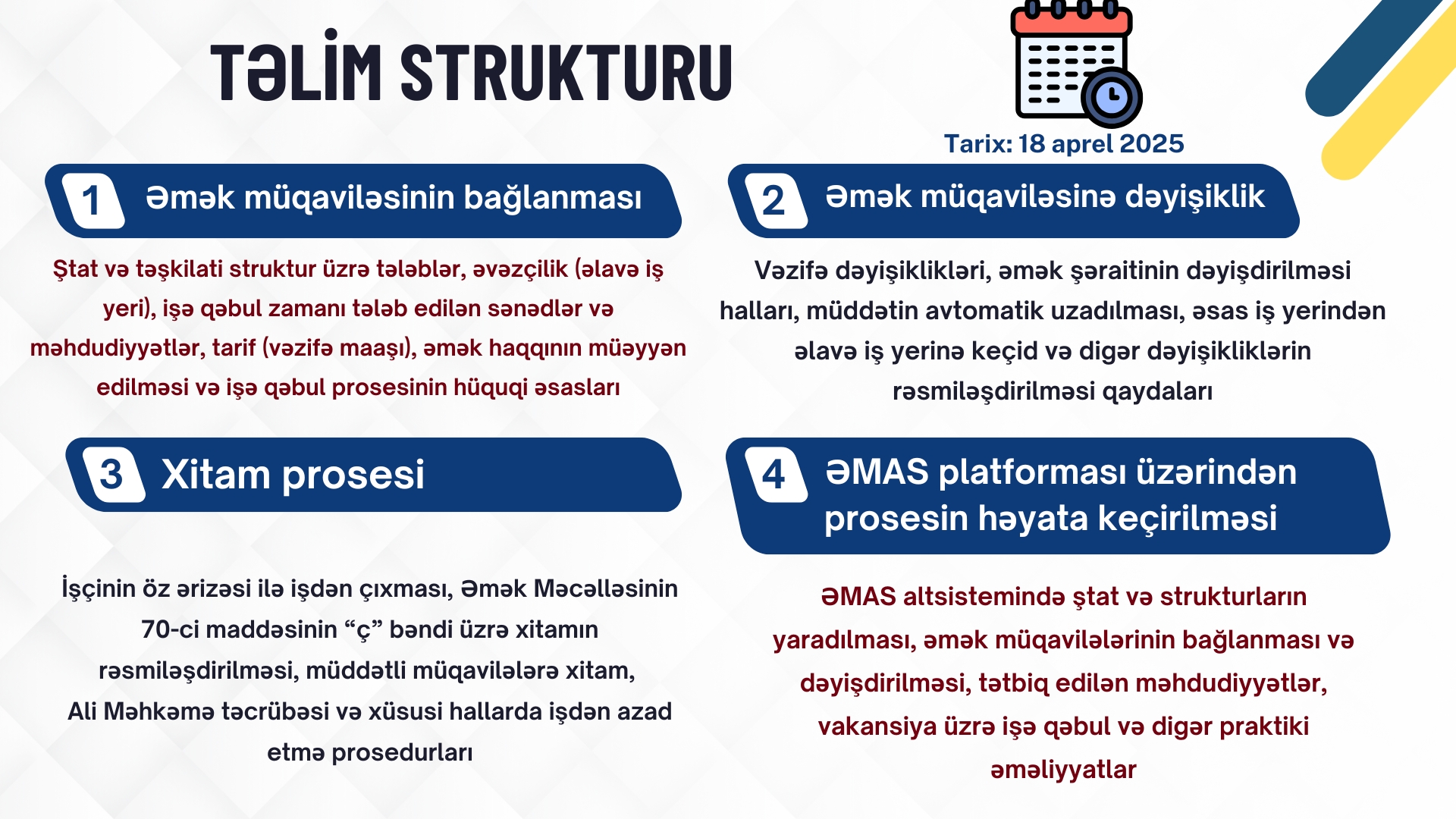 Xatırladaq ki, 25 aprel 2026-cı il tarixdə saat 10:00-da onlayn formada keçiriləcək “Əmək müqaviləsi: A-dan Z-yə” mövzusunda tematik təlimdə əmək qanunvericiliyinə edilən son dəyişikliklərin əmək müqaviləsinə təsiri də ətraflı şəkildə izah olunacaqdır. Təlimdə iştirak üçün qeydiyyat 050 368 12 72 nömrəsi (WhatsApp aktivdir) vasitəsilə aparılır. Təlimin strukturu haqqında məlumatı da paylaşırıq: