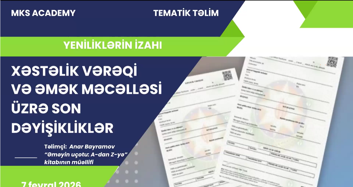 MKS Academy 18 yanvar 2025-ci il tarixdə “ƏMAS Platforması: A-dan Z-yə” və “İş vaxtının uçotu və əmək müqaviləsinə xitam” mövzularında tematik təlim keçirəcək. Saat 10:00-da başlayacaq “ƏMAS Platforması: A-dan Z-yə” təlimi onlayn (ZOOM) formatda olacaq. Saat 13:30-a planlaşdırılan “İş vaxtının uçotu və əmək müqaviləsinə xitam” təlimi isə Caspian Plazada əyani formatda keçiriləcək. Təlimlərdə iştirak üçün 050-368-12-72 saylı (what’s app da aktivdir) telefonla və ya mksacademy2022@gmail.com email ünvanı ilə əlaqə saxlamaq lazımdır.