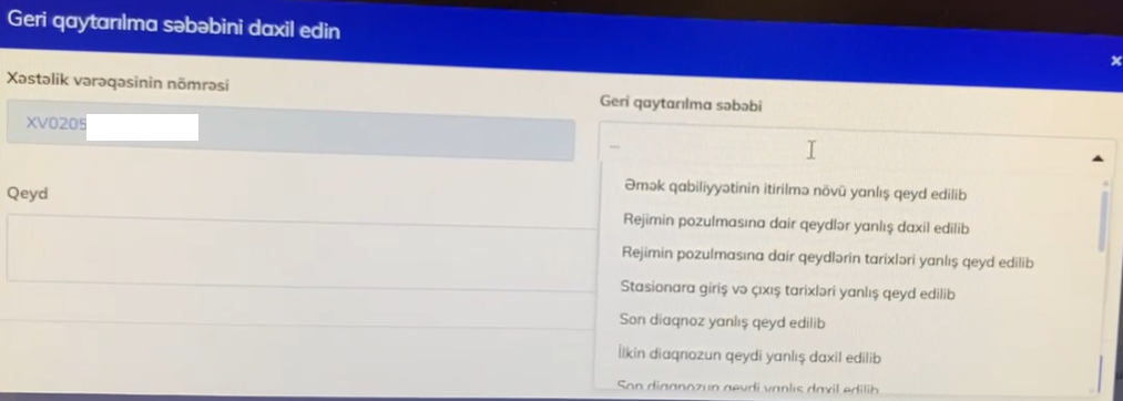 “Geri qaytar” düyməsini sıxdıqdan sonra xəstəlik vərəqəsinin geri qaytarılması səbəbi seçilməklə qeydlər aparılmalıdır: