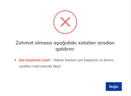 Əmək Məcəlləsinin 103-cü maddəsinin birinci hissəsinə əsasən, İş günü (növbəsi) ərzində işçilərə istirahət və nahar etmək üçün fasilə verilməlidir. ƏMAS altsistemində edilən dəyişiklik nəticəsində iş vaxtının saatından asılı olmayaraq nahar fasiləsinin iş vaxtı ərzində qeyd edilməsi mütləq tələb kimi müəyyən edilib. İşəgötürən tərəfindən nahar fasiləsinin iş vaxtından kənar müddətdə qeyd edildiyi halda aşağıdakı formada məhdudiyyəti bildirişi ƏMAS altsistemində tətbiq ediləcək: