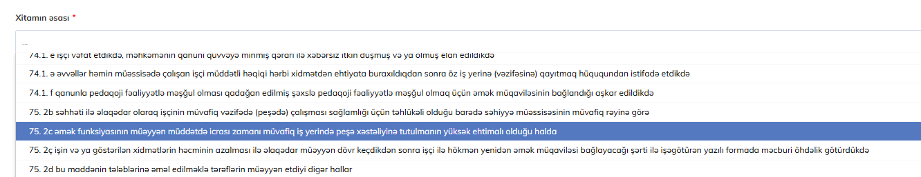 Əmək Məcəlləsində edilən son dəyişikliklər nəticəsində bəzi işəgötürənlər tərəfindən işçilərin əmək müqaviləsinə xitam zamanı sui-istifadə edilən Əmək Məcəlləsinin 75-ci maddəsinin ikinci hissəsinin “a” bəndi (tərəflərin qarşılıqlı razılığı ilə) ləğv edildi. Qeyd edək ki, ƏMAS altsistemində də xitam əmri tərtib edilərkən həmin maddəyə istinad imkanı artıq mövcud deyil, yəni sözügedən bənd siyahıdan çıxarılıb: