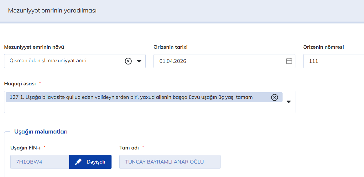 ƏMAS altsistemində edilən dəyişikliklərə əsasən, işəgötürən qismən ödənişli sosial məzuniyyət əmri hazırlayarkən mütləq olaraq 3 yaşınadək övladın FİN kodunu daxil etməlidir: