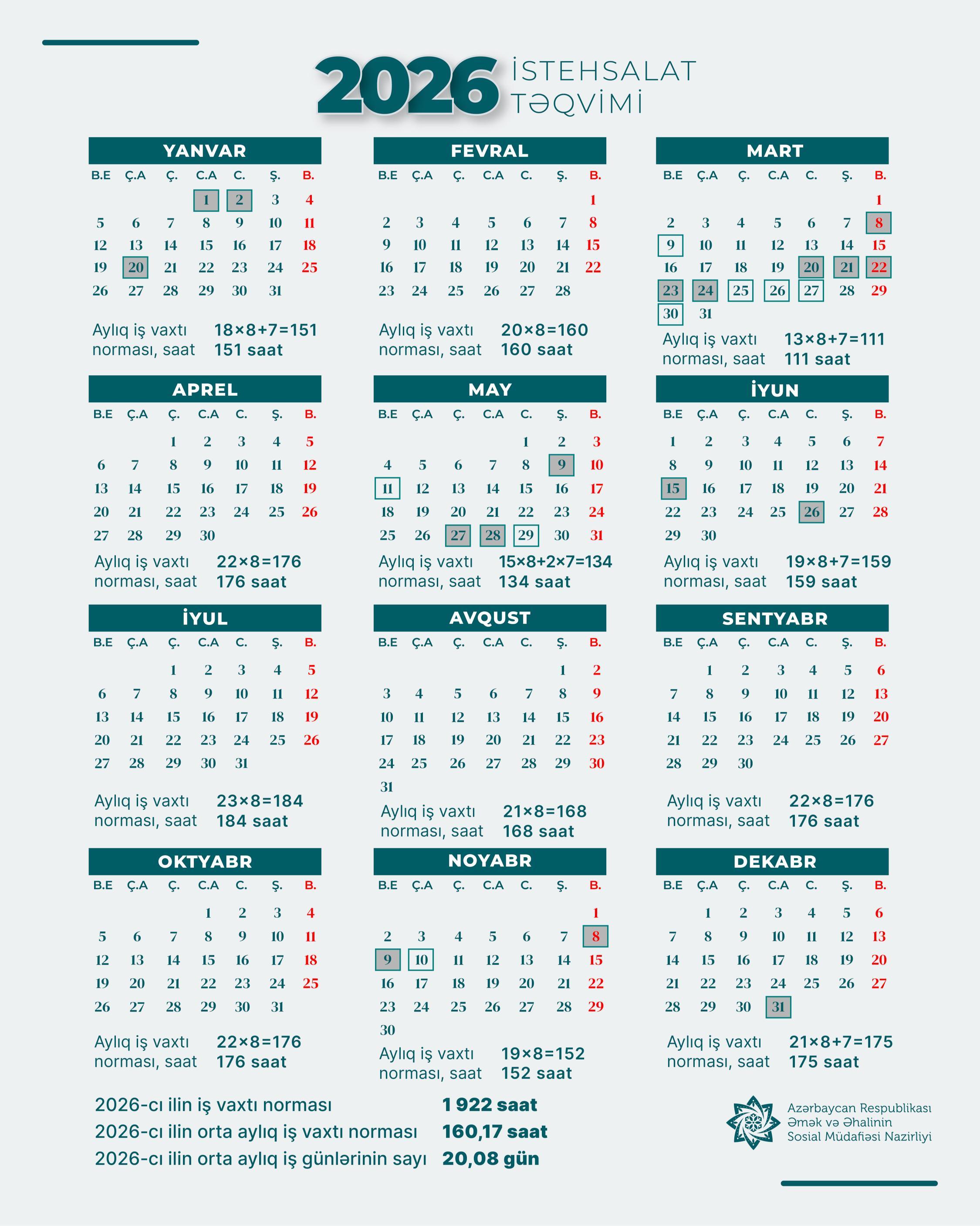 2026-cı il üçün iş vaxtı normasının və istehsalat təqvimi təsdiqləndi.