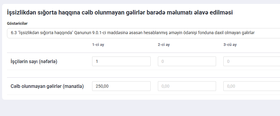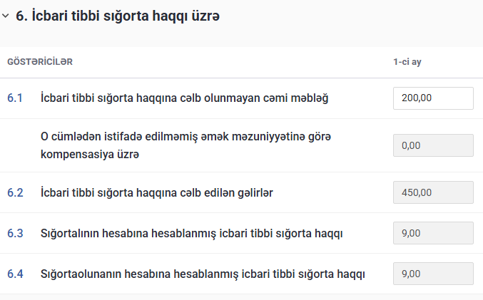 İlk olaraq, vahid bəyannamənin 1 saylı əlavəsində işçinin ümumi gəliri 650 manat (400 manat əmək haqqı + 250 manat müavinət) kimi qeyd edilir. Eyni zamanda, işçi 5 iş günü işləmədiyinə görə işlədiyi günlərin sayı 14 iş günü (19 – 5) kimi göstərilir.