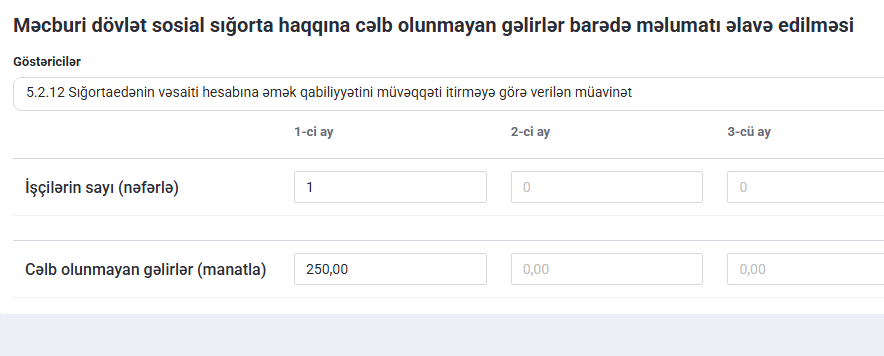 İşçinin işləmədiyi günlər barədə məlumatlar 1 saylı əlavənin 3-cü altbölməsində qeyd edilməlidir. Misalımıza əsasən, işçi 5 iş günü əmək qabiliyyətini müvəqqəti itirdiyi üçün bu məlumat müvafiq qaydada daxil edilir.