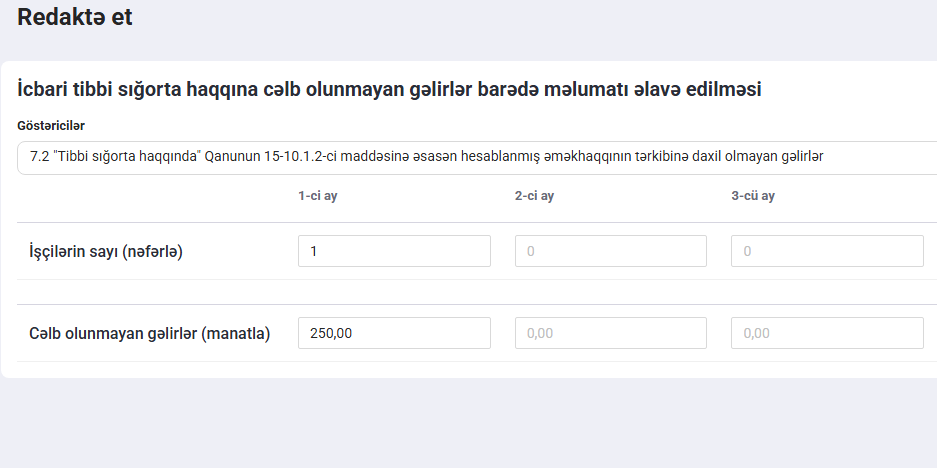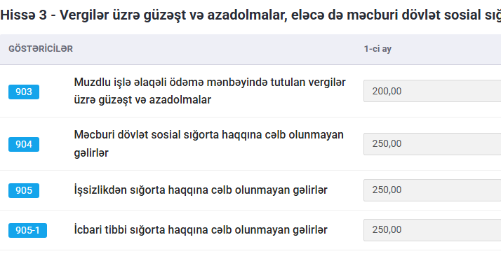 Beləliklə, vahid bəyannamənin “Əsas hissə” → “Hissə 3” bölməsində (güzəştlər və azadolmalar üzrə) məlumatlar sistemləşdirilmiş şəkildə əks olunur: