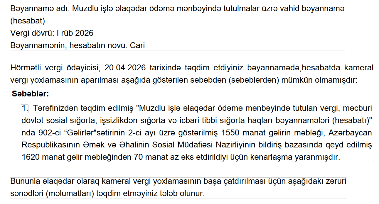 İşəgötürənlər tərəfindən “Muzdlu işlə əlaqədar ödəmə mənbəyində tutulmalar üzrə vahid bəyannamə”nin təqdim edilməsi üçün son tarix 20 aprel 2026-cı il olmuşdur. Bəyannamənin təqdim olunması zamanı vergi orqanı tərəfindən ilkin mərhələdə müəyyən texniki və məzmun xətaları aradan qaldırılsa da, dövlət qurumu aparılan kameral yoxlamalar nəticəsində bəzi vergi ödəyicilərinə uyğunsuzluq bildirişləri daxil olmuşdur.